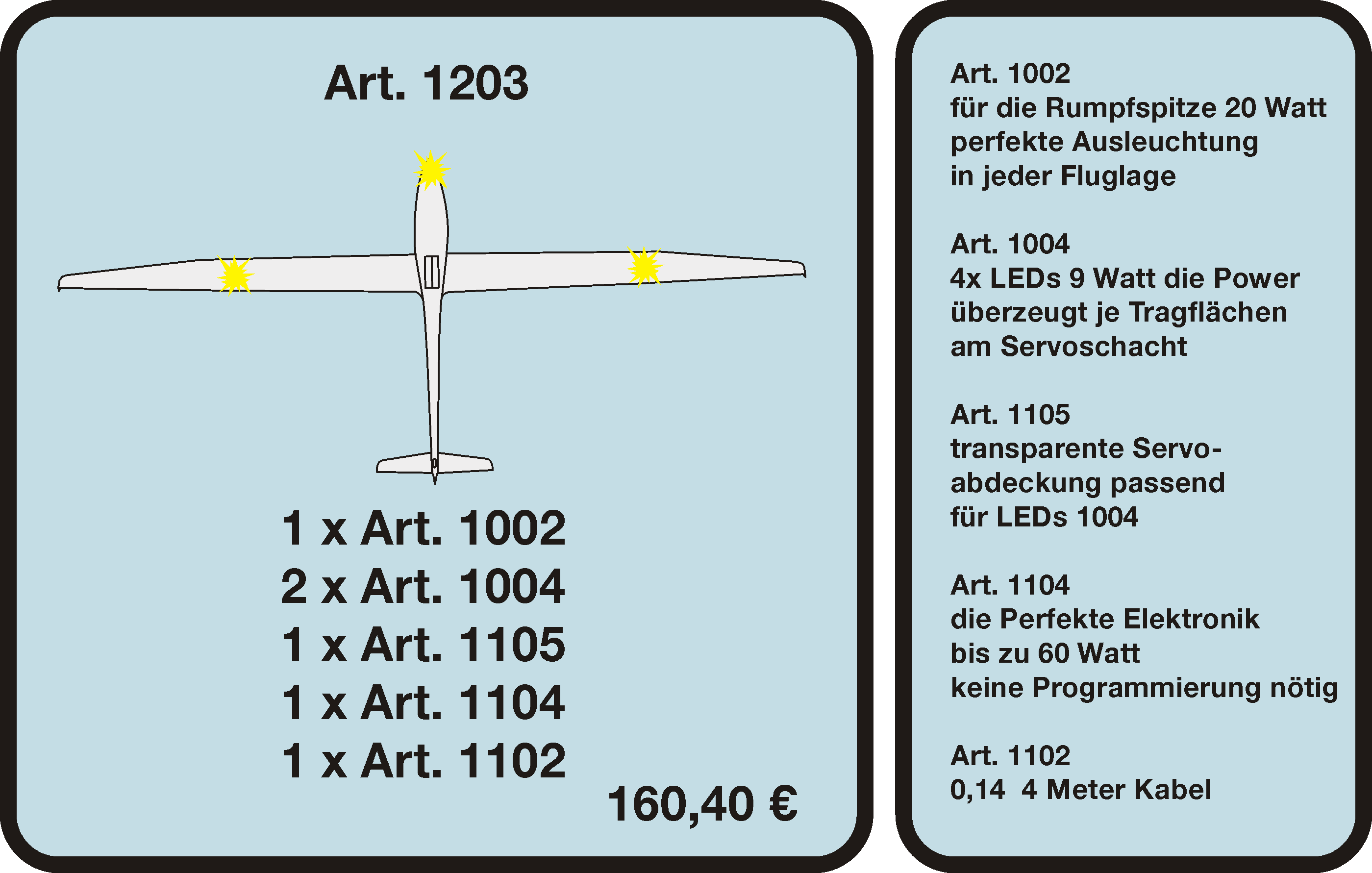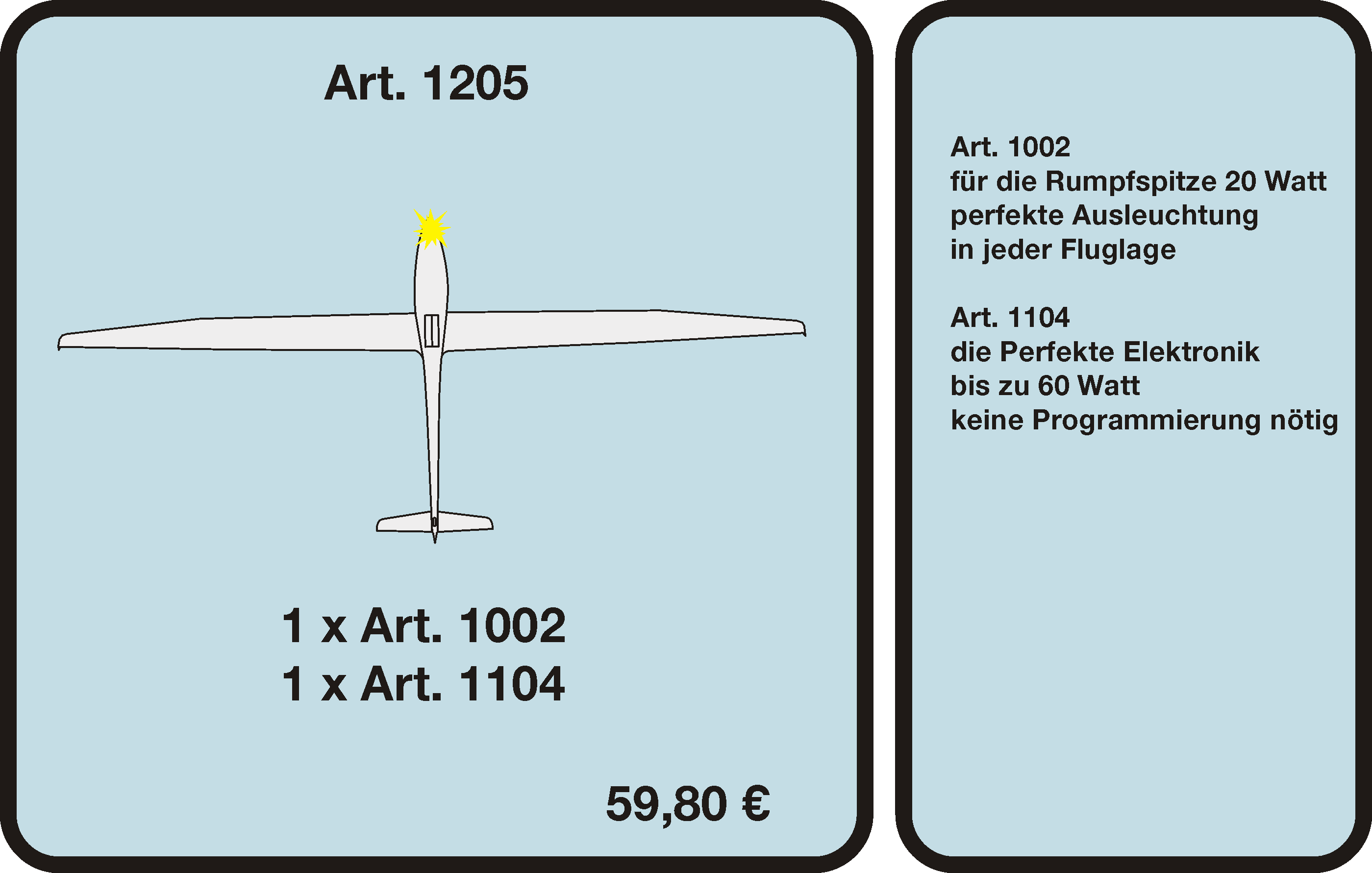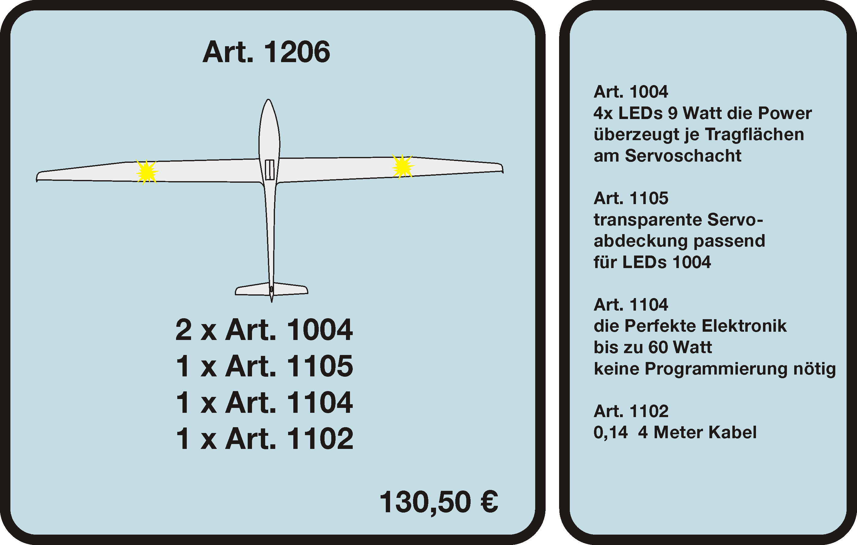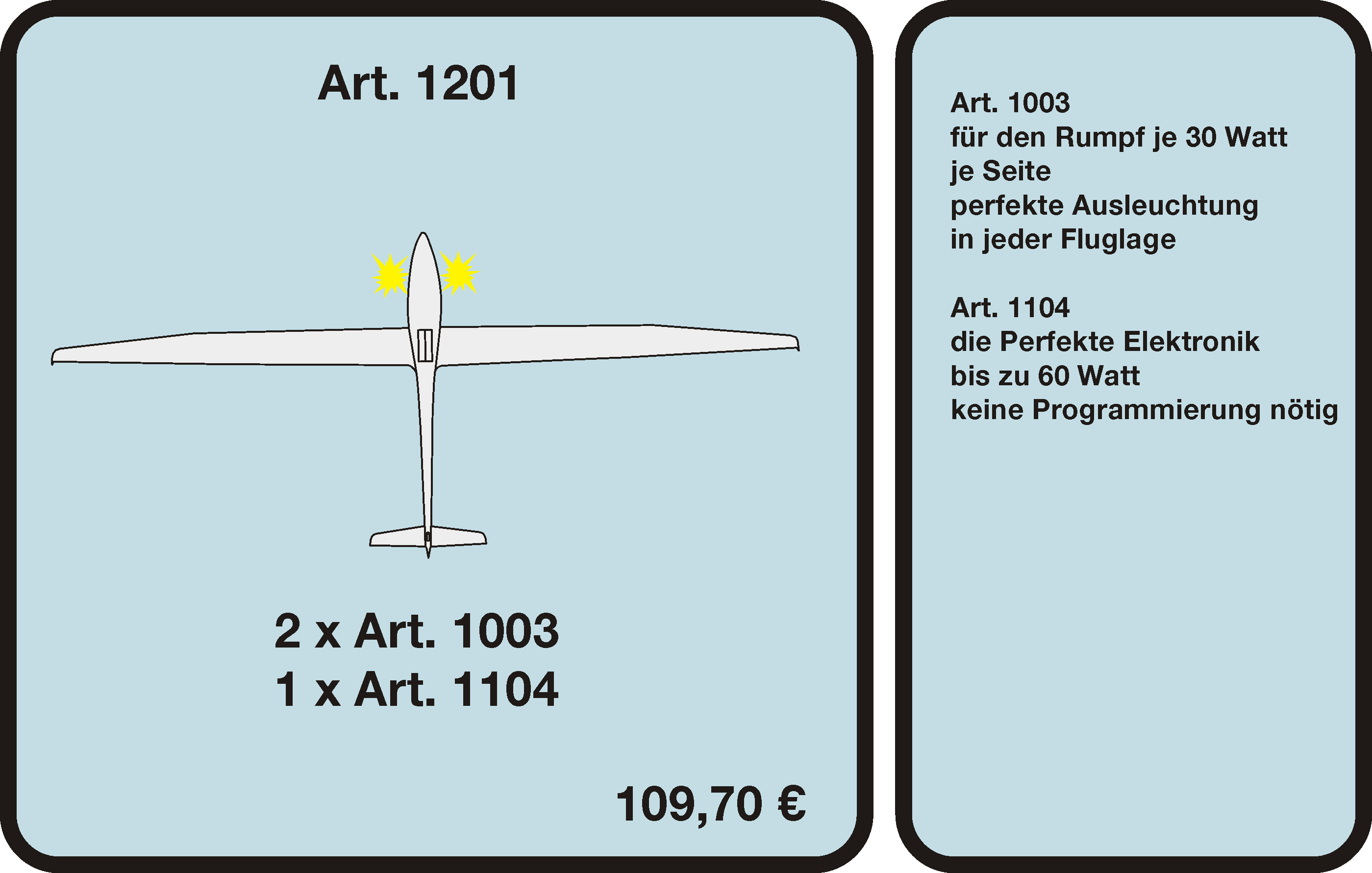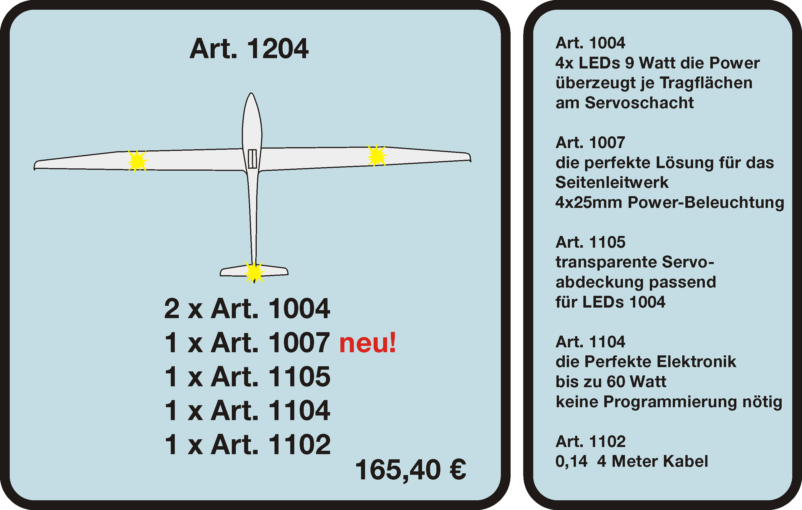 Unsere leistungsstarken LED-Sicherheitslichtsysteme verbessern die Sichtbarkeit deiner Modelle auch bei schwierigen Lichtverhältnissen. Für mehr Sicherheit bei jedem Einsatz. Entdecke unsere Produkte und sieh dir in der Kunden-Galerie an, wie Modellbauer ASC-Safetylight nutzen.
